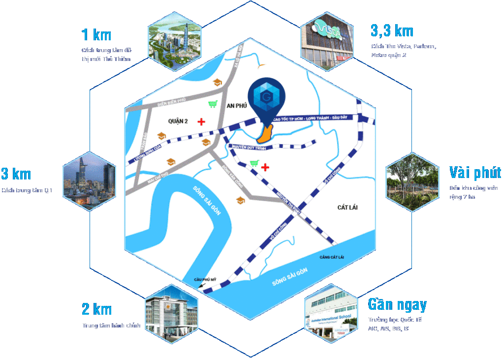 Với 5- 8 phút di chuyển, cư dân Gem Riverside nhanh chóng kết nối đến các điểm: Vincom quận 2, công viên An Phú, bệnh viện Quốc tế Mỹ, bệnh viện D2, trường Quốc tế Úc, tuyến Metro số 2,…